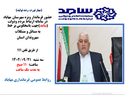 فرماندار ویژه مهاباد فردا سه شنبه از ساعت 11 تا 12 در سامانه سامد آمادهی پاسخگویی به سؤالات مردم است.