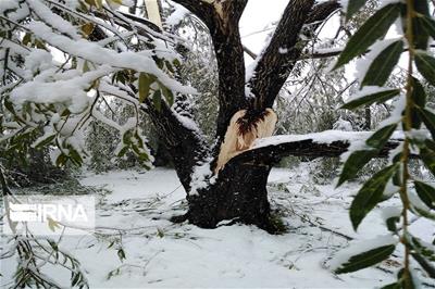 شکستن شاخ و برگ درختان بر اثر بارش برف سنگین در مهاباد